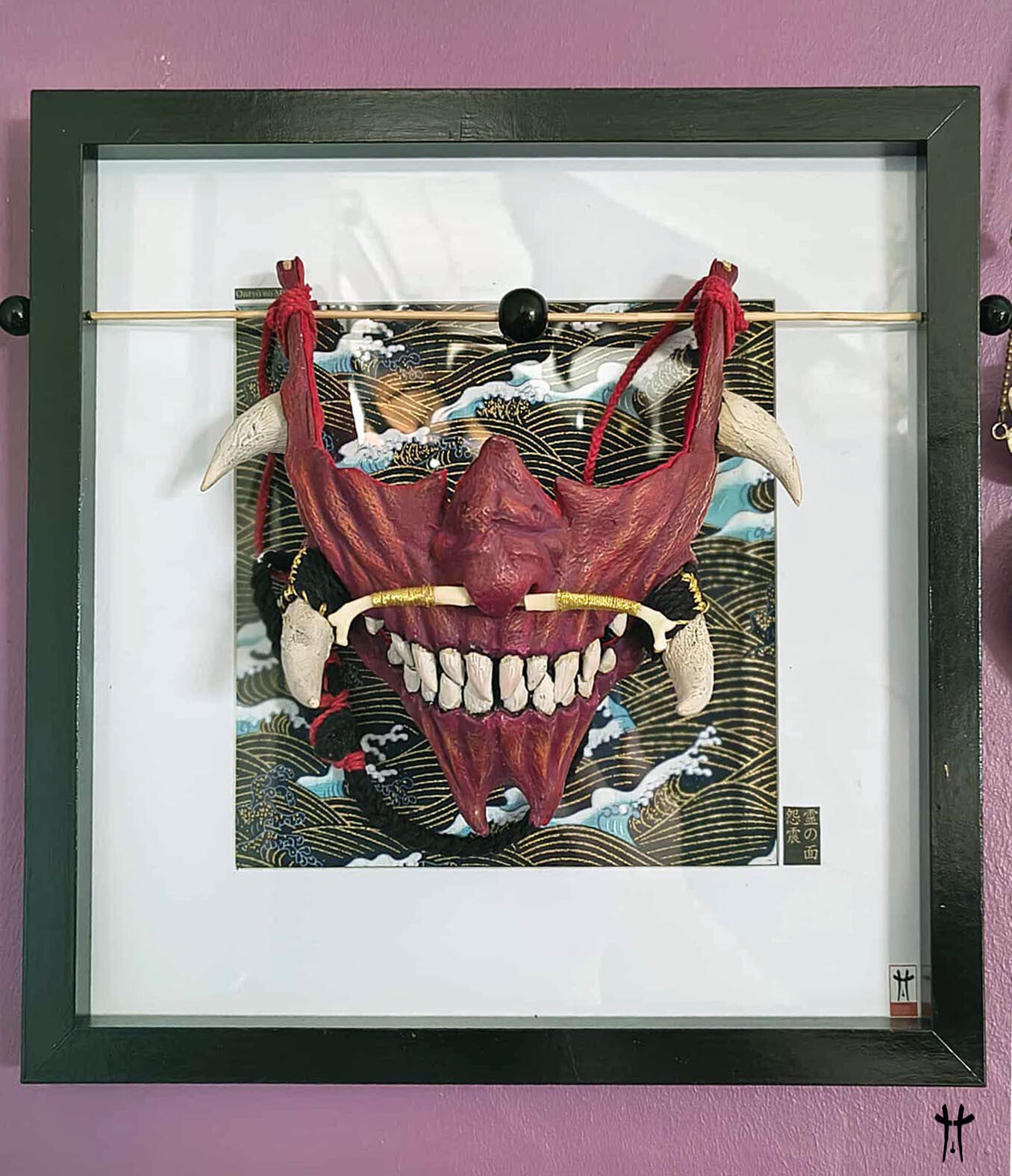 L’œuvre est présentée sur un cadre carré noir, orné en son centre d’un tissu japonais représentant la mer et les vagues, rappelant l’harmonie entre mouvement et force intérieure.