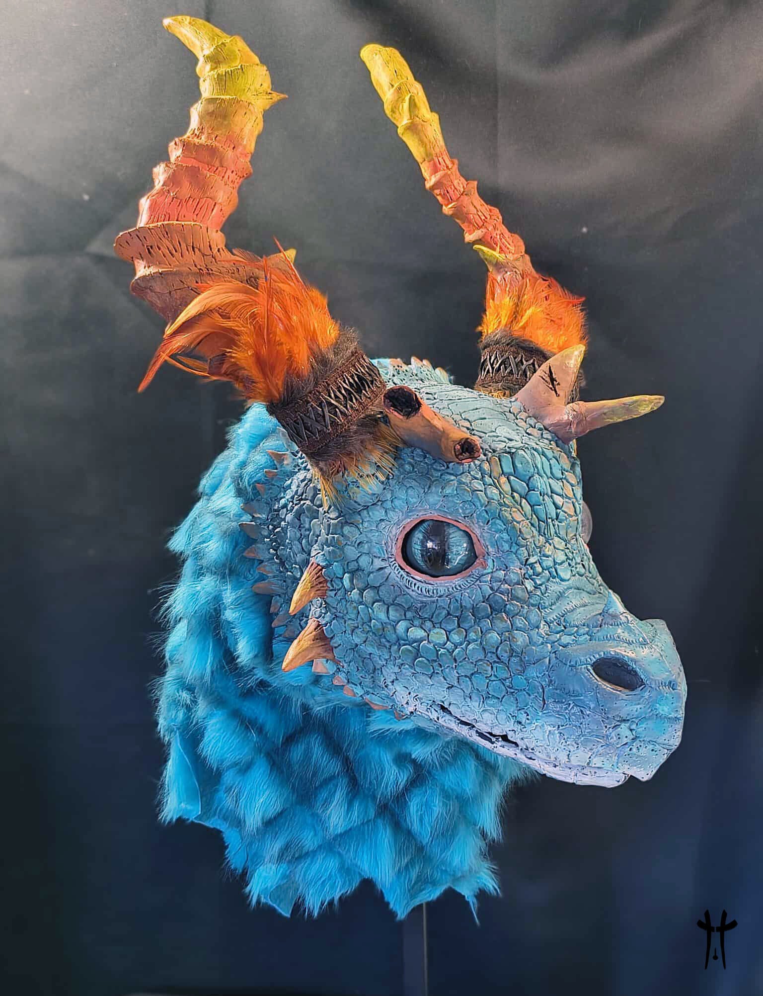 Sa peau d’écailles azur et sa crinière de plumes flamboyantes rappellent le feu caché sous la glace.